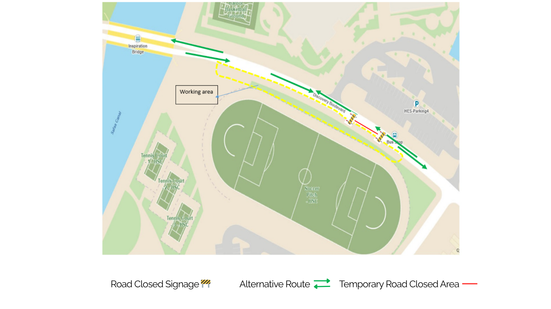 Please note that a section of Discovery Boulevard Road, along with the HSC Soccer Pitch, will be partially closed from November 1 to November 28, 2025, due to maintenance and repair work.