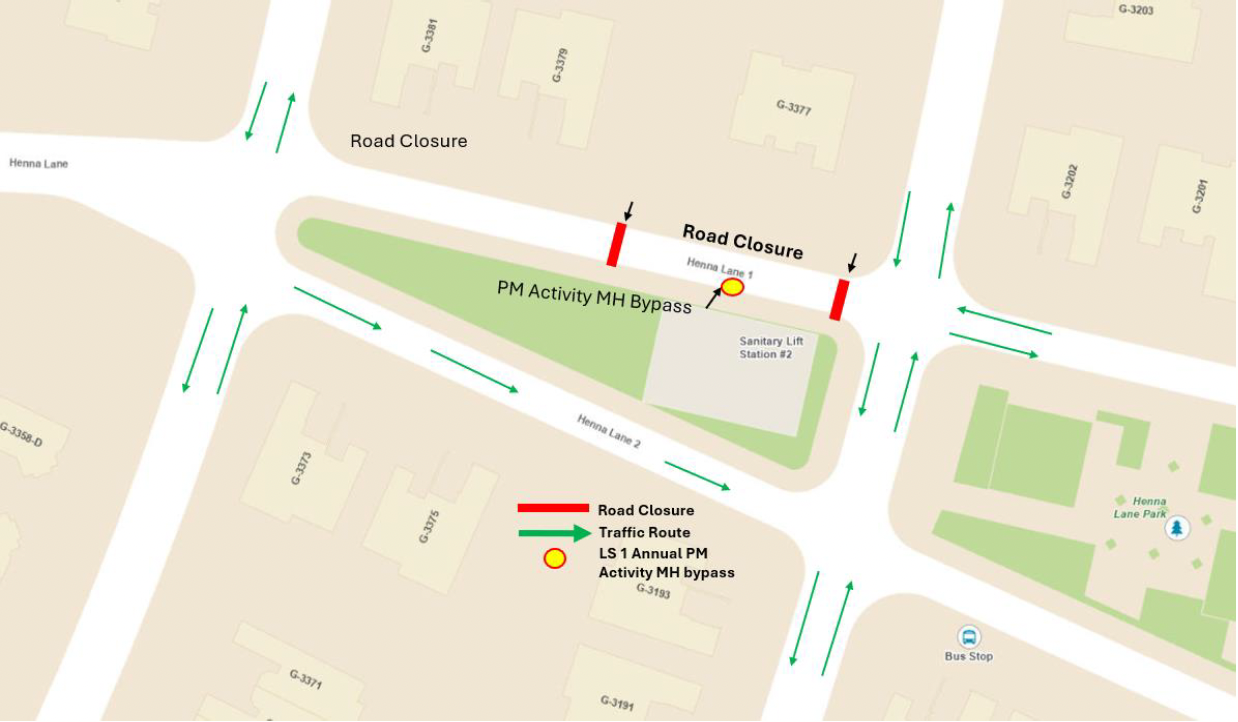 Please note that a section of Henna Road 1, opposite Villa G-3377 and Sanitary Lift station # 2, will be fully closed from November 9 to November 20 due to maintenance work and Sewage system bypass.