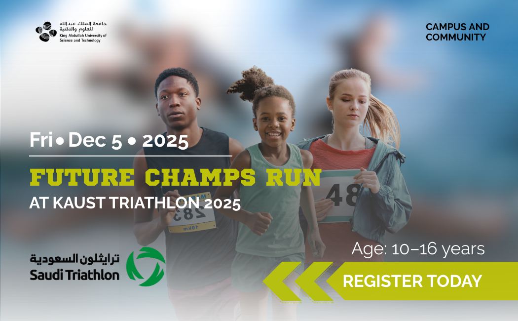 Campus and Community (C&C) at KAUST is excited to invite KAUST community members and externals aged 10 to 16 to participate in the inaugural Future Champs Run, as part of the KAUST Triathlon 2025 on Friday, December 5, 2025, sponsored by the Saudi Triathlon Federation (S3F). We extend a special thank-you to the Saudi Triathlon Federation (S3F) for their generous sponsorship and continued support for the triathlon which incorporates this new event.