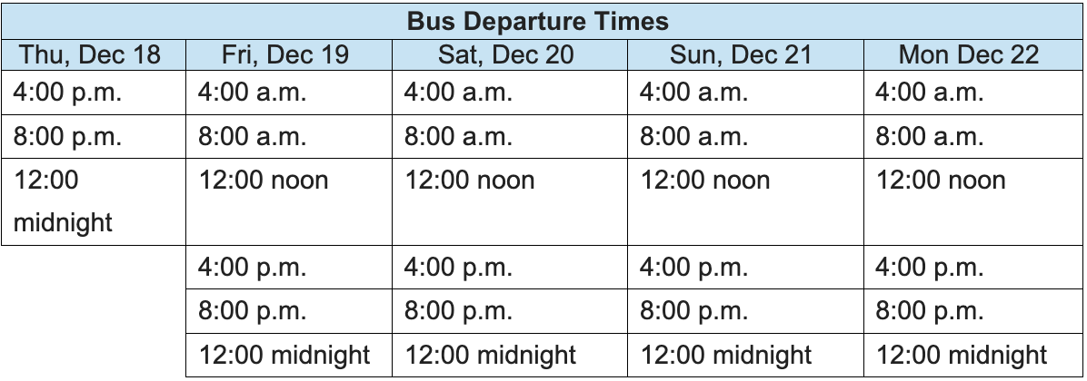 Campus and Community (C&C) is pleased to provide complimentary airport shuttles for the upcoming holidays. Buses will be running from KAUST to Jeddah International Airport Terminal 1 from December 18 to 22. Please see the schedule below for exact times.