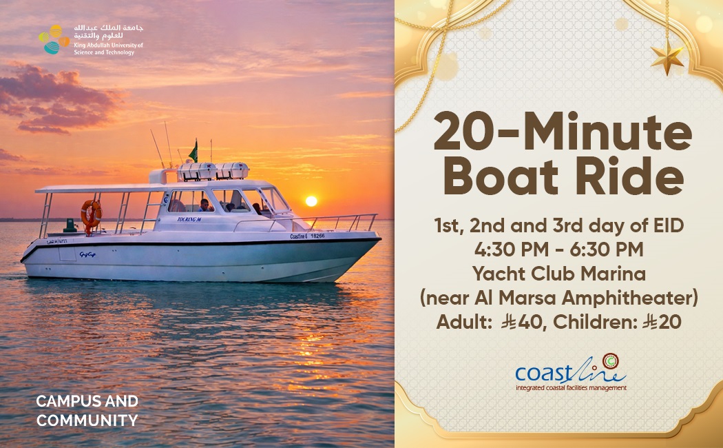 Celebrate Eid on the water! Join us on the first, second, and third days of Eid for a relaxing 20-minute boat ride along the beautiful Red Sea. Gather your loved ones and meet us at Al Marsa Amphitheater from 4:30 p.m. to 6:30 p.m. to enjoy the sea breeze and make the most of your Eid evenings together.